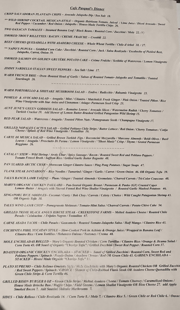 Cafe Pasqual's in Santa Fe, NM, offers a vibrant Southwestern menu that truly celebrates bold flavors and fresh ingredients. Known especially for its breakfast and brunch, this cozy spot serves standouts like corn pancakes, chorizo breakfast quesadillas, and the intriguing huevos motuleños—a dish that delights with creative layers of taste. Patrons rave about the expertly seasoned carne asada and savory mole enchiladas, both reflecting authentic regional influences. The smoked salmon and ribeye bring depth and variety to the menu, balancing traditional and innovative dishes with finesse.